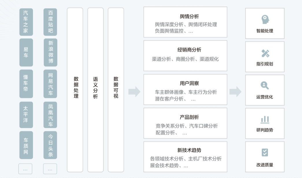 基于此,美云智数星谋云汽车行业解决方案监控10000+主流汽车相关网站,覆盖100+汽车品牌、900+车系,融合外部互联网舆情、用户、产品、渠道、技术大数据,为车企提供市场营销舆情分析、经销商分析和产品企划的用户洞察、产品剖析及新技术趋势等一站式在线分析。