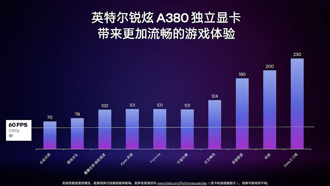 在游戏性能测试中,官方公布数据ARC A380能够为《英雄联盟》《绝地求生》《永劫无间》等多款主流游戏提供强大性能,提供 1080p @60fps 以上的流畅游戏体验,支持包括基于硬件加速的光线追踪在内的 DirectX 12 Ultimate 全部功能,能够帮助玩家畅玩更多热门游戏大作。