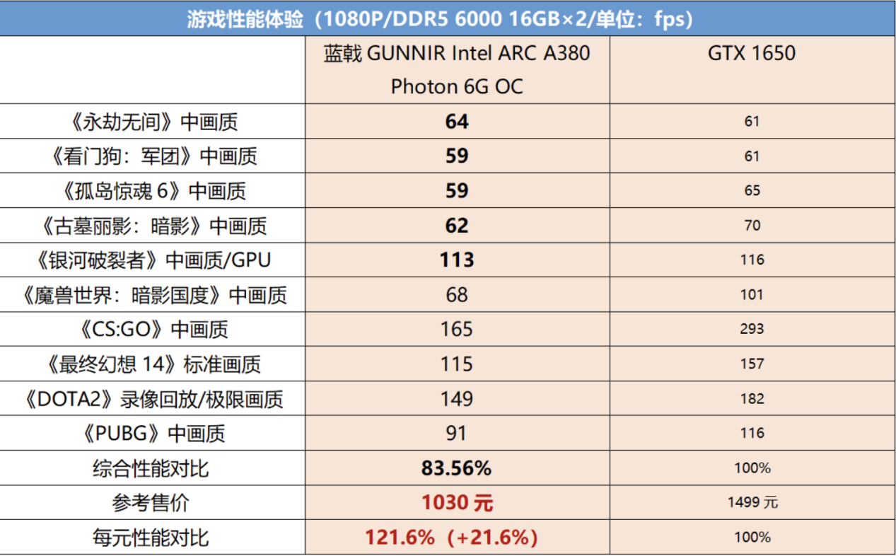 在游戏实测方面,蓝戟GUNNIR A380 Photon可以以60fps左右的平均帧率流畅运行主流1080P游戏,其中不乏《看门狗:军团》《孤岛惊魂6》《古墓丽影:暗影》这样的3A大作,其它电竞网游也基本可以保证100fps左右的水平。在较新的游戏大作中,蓝戟GUNNIR A380 Photon的表现依旧给力,《永劫无间》中甚至超过了GTX 1650,看门狗:军团》、《孤岛惊魂6》、《古墓丽影:暗影》、《银河破裂者》中则与GTX 1650非常接近,帧率差距只有个位数而已。此外特别值得点赞的是,作为Intel首发的零售版台式机独显,ARC A380的驱动程序稳定性令人惊喜,在性能优化方面也具有很大的潜力空间,再次印证入门级显卡已然达到了主流中端显卡的水平。