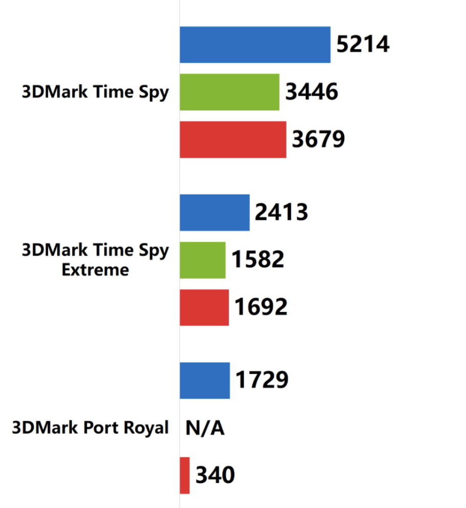 在3DMark显卡性能理论测试中,测试平台为Intel酷睿i5-12600K处理器、Z690主板、DDR5 6000 32GB双通道。选用对比显卡为市场定位相同的NVIDIA GeForce GTX 1650和AMD Radeon RX 6400。从3DMark Fire Strike的3个场景的测试成绩来看,A380的综合理论性能落后RX 6400约2%,并领先GTX 1650约23%。