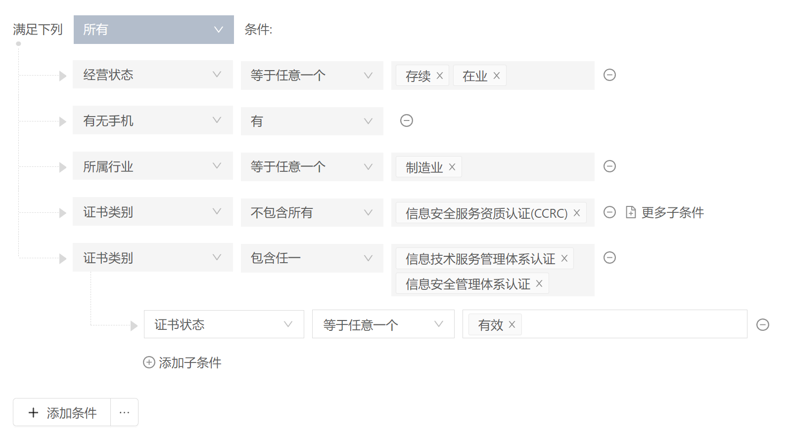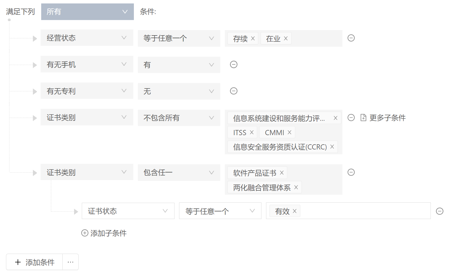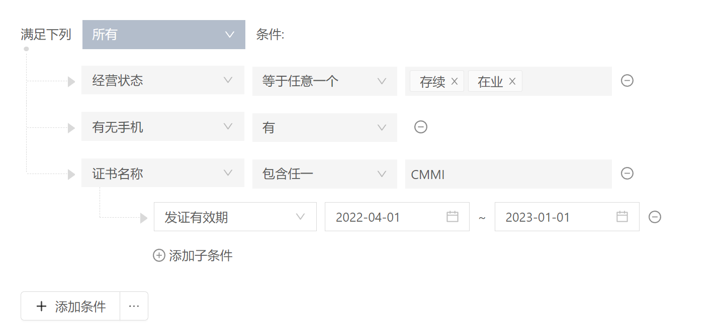 成立时间超过一年,有自己相关的软件专利或者是软件著作(两化融合,双软证书),但是目前没有做过证书的,都可以批量筛选出来。