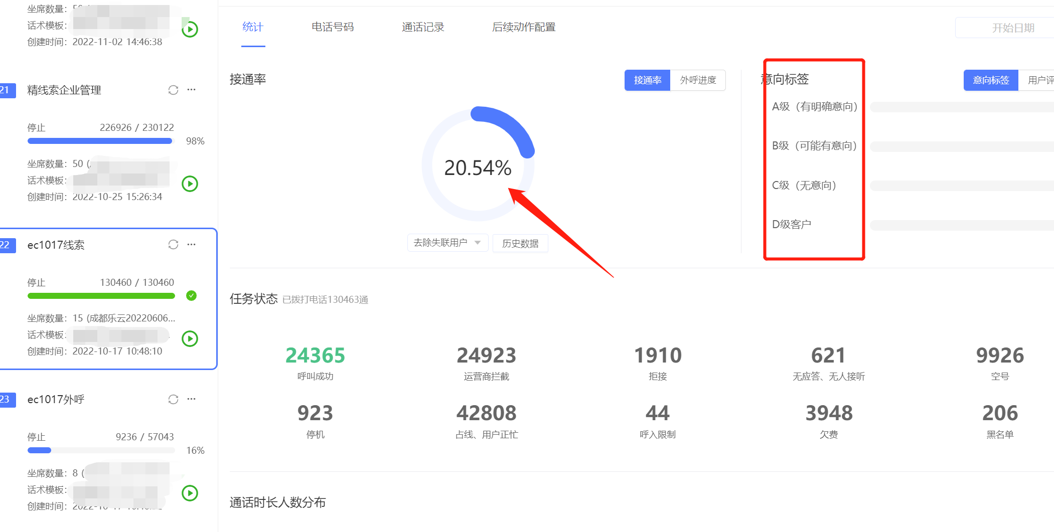 外呼话术会配置真人话术录音,根据不同的对话场景,智能识别对话内容进行批量筛选出有意向度的客户,最后再分配线索给销售去做进一步跟进。