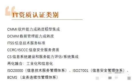 IT资质认证公司主要就是为一些IT信息技术、系统集成类企业提供相关资质认证咨询服务的公司,包括不限于CMMI、ITSS、CCRC、CS、CCID、信息系统集成资质、两化融合(工业化和信息化)等。