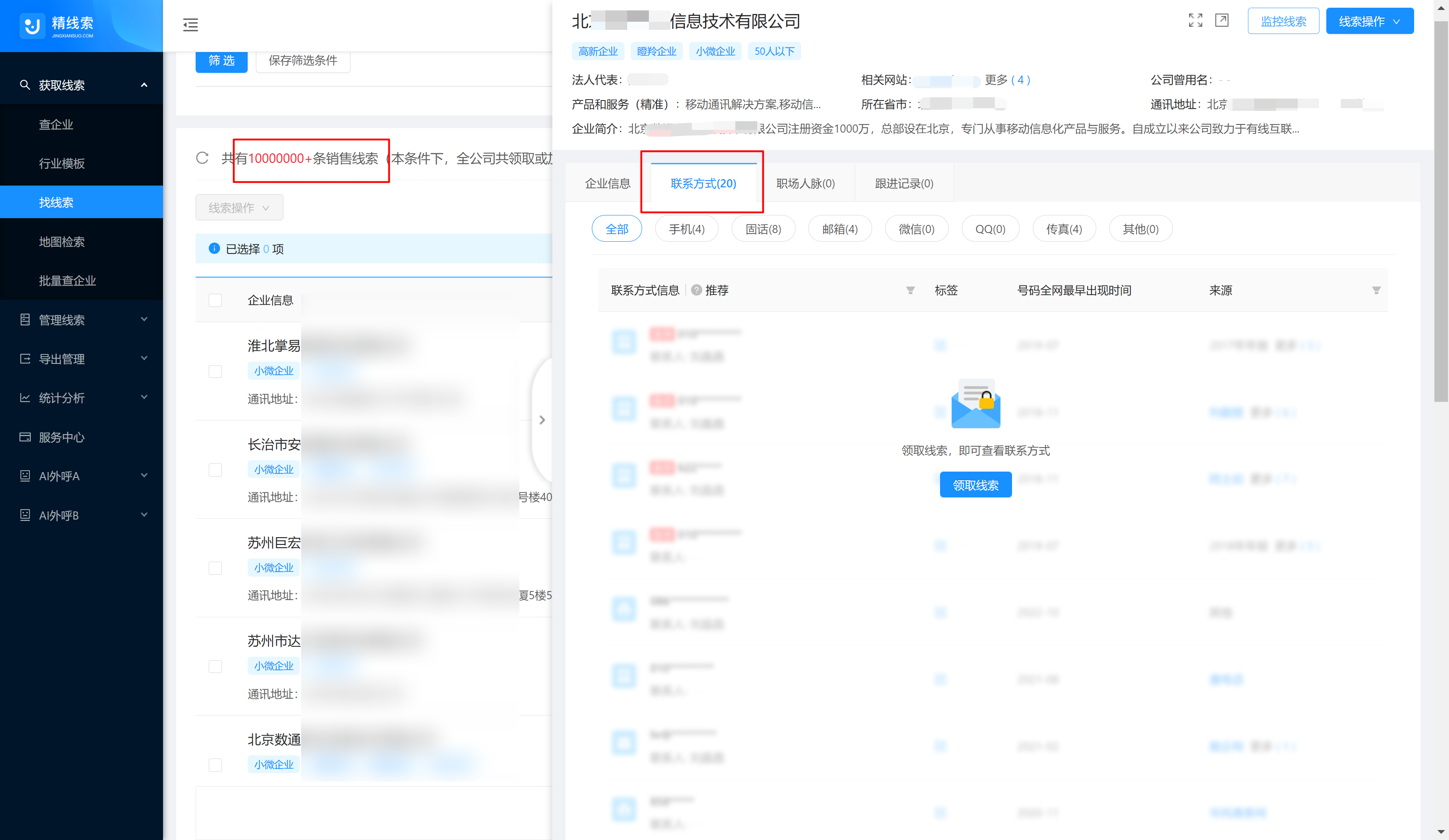 一键筛选,资源池中就会有大概10W条潜在客户线索,随便点进一条,企业全方位的信息一览无余。咱们选择没有被其他同事领取的线索,进行开发。