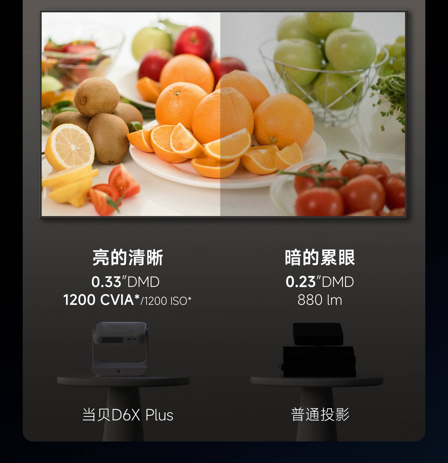 投影仪的画质核心由光源亮度与显示芯片决定。当贝D6X Plus搭载1200CVIA流明亮度(中国投影行业统一标准),实测光效显著优于极米RS 10 mini的800 ANSI流明,在白天或开灯环境下画面清晰度优势明显,而极米更依赖暗光环境发挥三色激光技术优势。