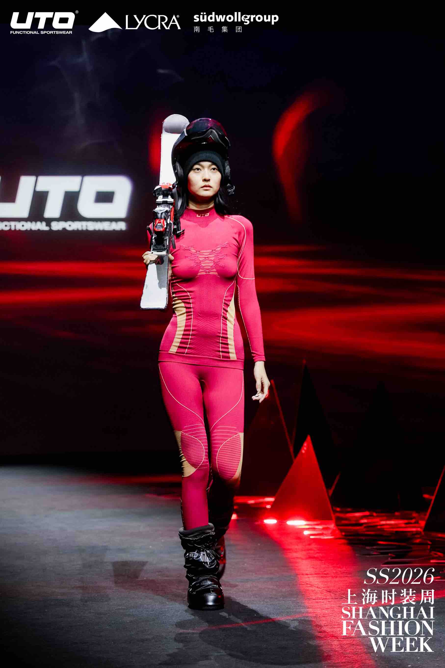 作为“无界”理念的延伸,UTO本次大秀的合作矩阵堪称亮点。品牌携手全球纤维科技领导者LYCRA®(莱卡®)品牌与与享有盛誉的Südwolle Group (德国南毛集团)品牌,共同打造这场科技与美学的盛宴。南毛集团作为全球知名的全羊毛和羊毛混纺类精纺纱线供应商,其高品质的天然原料为UTO产品带来了绝佳的亲肤触感与环保属性;而LYCRA®(莱卡®) 纤维提供的卓越弹性与持久舒适度,则确保了时装化设计的同时不失运动所需的自由感;此外,UTO贴身层更有THERMOLITE® ALL SEASON纤维的加持,其创新型纤维结构可以感应微环境变化, 保暖控湿,为穿着者提供全天候的温暖舒适的穿着体验。THERMOLITE® 品牌作为全球领先的轻质保暖科技品牌,致力于为消费者提供温暖、干爽与舒适的穿着体验。
